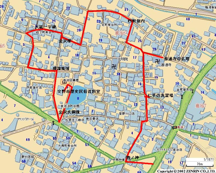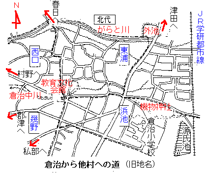 旧倉治の集落一帯を東浦と呼びます。「浦」という字には畑という意味があります。「浦」は表裏の「裏」の意味も持っており、集落の東の裏手にある畑を指しています。 他にも、この地名からは倉治が防衛機能を備えた環濠集落であった可能性が考えられます。環濠集落には「浦」「代」「口」のつく地名が多くみられ、倉治にも東浦を中心に「北代」「西口」などの地名が残されています。集落は北にがらと川、南は中川に挟まれており、中を通る道は狭く、カギの手に折れ曲がっていて、防衛に配慮した造りになっています。 |