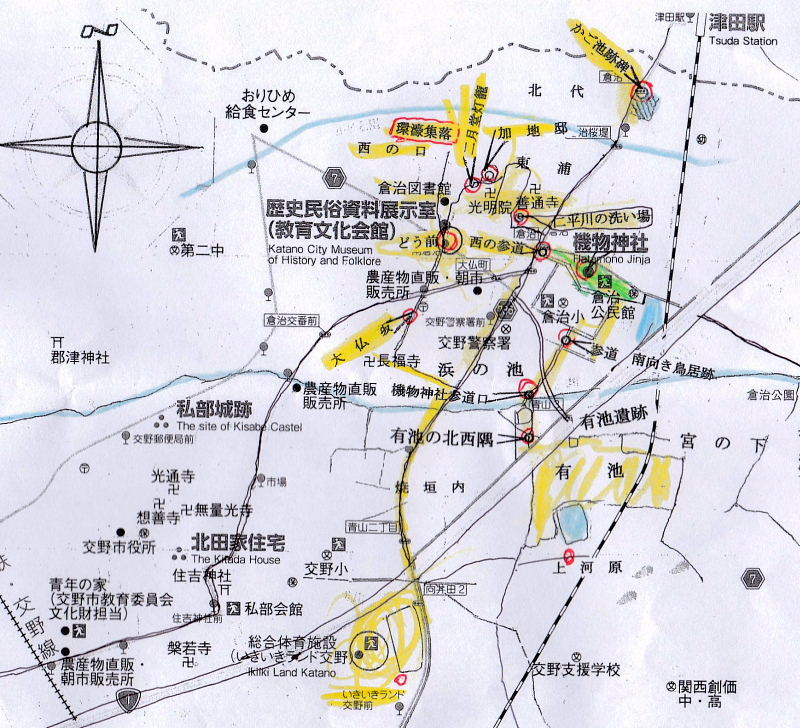 他にも、この地名からは倉治が防衛機能を備えた環濠集落であった可能性が考えられます。環濠集落には「浦」「代」「口」のつく地名が多くみられ、倉治にも東浦を中心に「北代」「西口」などの地名が残されています。集落は北にがらと川、南は中川に挟まれており、中を通る道は狭く、カギの手に折れ曲がっていて、防衛に配慮した造りになっています。 |