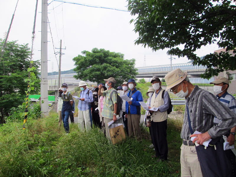 ![]() 免除川の堤防の上で解説・案内された。 |