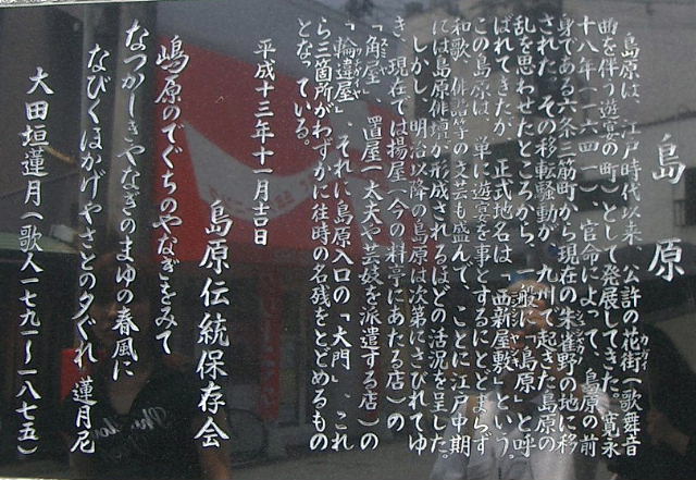 島原は、官命により、寛永18年(1641)に島原の前身である「六条三筋町」から現在地の朱雀野に移されました。その移転騒動が、四、五年前に九州で起きた島原の乱を思わせたことから、「島原」と呼ばれるようになりましたが、正式地名は「西新屋敷」といいます。島原への移転した年を寛永17年とする説もありますが、それは移転命令の年で、実際の移転は翌18年のことであります。 |
