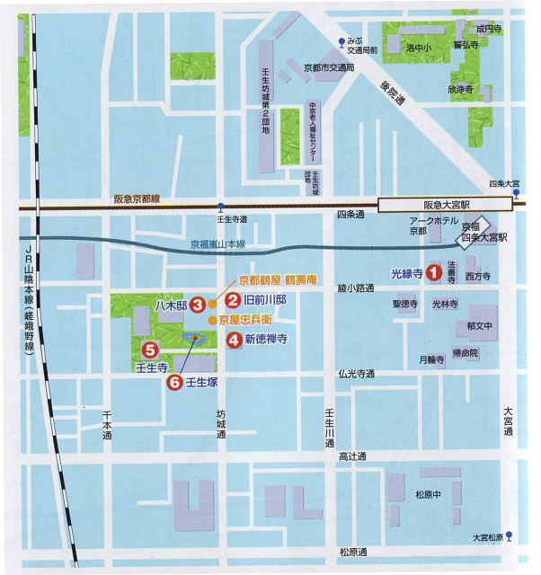 京阪枚方市駅→京阪四条→阪急四条→大宮駅で下車→@光縁寺→A旧前川邸→