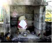 駅筋を南に折れ農道を行くと、名も無い地蔵さんに出会う。朝日を背に受けて眩しい。