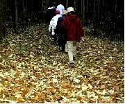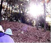 落ち葉を踏みしめゆっくりと登る、足にふんわりとした感触が気持ちいい。竹薮の中で「新川」と出会う。途中、静かな山に座り耳を澄ますと、鳥の鳴き声があちこちから聞こえてきた。尾根を上がるに従って、時々木々の間に朝日が差し込み明るくなってきた。さらに尾根を登ると、古墳も近い。