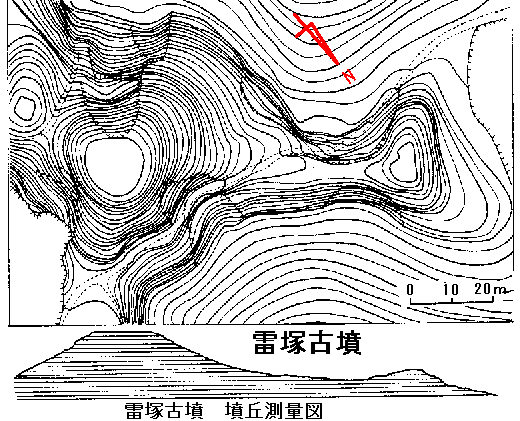 最も大きな前方後円墳(雷塚)はパチ形をして前方部が低い古式古墳である。