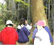 前回も訪れた「森の城戸」で、大きな灯篭と蛙石にまた、牛追い石にも挨拶を済ませて、森の民家を抜けていよいよ森古墳群の山へと踏み入った。少し上がると右手に農業用水の池が二つあった。木々が茂りまわりは薄暗い。右手に大きな欅の古木があり、自然と、皆が古木に手をやり話し掛ける。この辺りを卵塔(らんとう)といい、この道を卵塔の道と言う。
