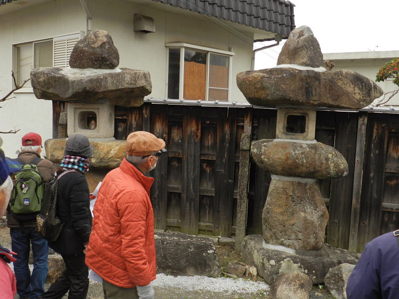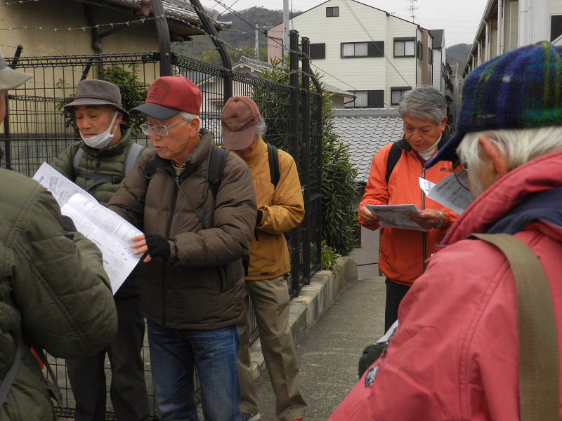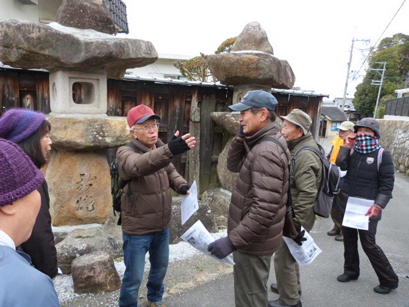 | 交野歴史健康ウオークは2月9日(土)午前9時、京阪河内森駅前に集合。前日より冬型の気候が強まり大変寒い日となりましたが、沢山のメンバー27名(会員22名)が参加され和気あいあい大変楽しいウォークとなりました。 先ず、高尾部長より挨拶があり、続いて、案内の村田事務局長よりウォークの行程と「絵巻物が語る交野の神人」の概略説明の後、須弥寺から寺古墳群へと出発しました。 森村の磐船村役場跡・地名を皮切りに、蛙石の伝説、須弥寺では五穀豊穣と子孫繁栄を願う陽石のこと、三十三観音、森惣墓入口の一石三尊にまつわる石仏や堂池に注ぐ新川の歴史の話、続いて寺古墳群の一つ「塚穴古墳」に入って見学。住吉神社、山添家、大畑古墳などを巡ってきました。 今回、森村に在住されている向井様が参加され、森村にまつわる詳しいお話をお伺いすることが出来て大変お世話になりましたこと、感謝申し上げます。 初めて参加された方からは、「いろんな歴史も良く分かり、尚且つ健康を願ってのウォークにすっかり嵌ってしまいました。」との感想でした。 |