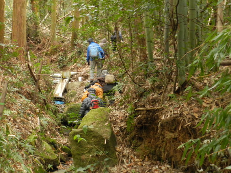 | 森新池を通り過ぎ、傍示への道を登ってゆくと、山側にU字溝で作られた小川が流れている。この小川を「新川」といい、200Mばかり登ったところに、交野水道局の貯水槽が2基あり、その手前を流れている小久保川から水の取り入れ口が造られている。 ここから延々1300mの水路が、森の山裾を縫うように堂池まで造られている。木立の中、薮が繁る中を先人達が苦労されて造られた貴重な水路である。 さらさらと流れる水の音を聞きながら、どんどんと小川沿いの小道を歩く。時々、立ち止まって回りの山合いを見渡し、心地良く水が流れる様に感激を覚える。幾度か曲がりくねった道を抜けると、突然目の前が開け、手前の森の村里の向こうに、交野市の町が一望される見事な風景が目の前に現れた。探検隊の皆、歓声を上げる。 堂池まで1300mを歩き、汗水流して造られた村人たちの苦労がしみじみと偲ばれた。堂池は沢山の水量で一杯だった。 堂池の北側の崖の海成粘土層を観察。森の惣墓に入ると、左手に迎え六地蔵、さらに一石三地蔵尊が祀られていた。その後、須弥寺で村里にあったといわれる沢山の石仏にお会いした。 円通山須弥寺の建っている場所が「堂ノ前」で、須弥寺の観音堂の建っている岡が「堂山」である。観音堂の山という意味で堂山と呼ばれている。 |
