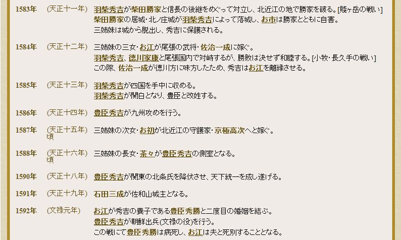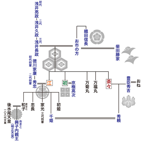長政とお市の子のうち、三人の娘たちは、戦国から江戸と続く動乱の時代の中で、歴史に大きく名を刻むこととなります。姉妹の名前は、茶々・初・江です。浅井と織田の血統を受け継いだ彼女らは、それぞれ豊臣、京極、徳川へと嫁ぎ、波乱の運命をたどっています。 天正元年(1573)、小谷城落城の年に生まれました。 動乱の中父母を亡くし、後見人となった秀吉の計らいで、天正12年(1582)に佐治一成(かずなり)と、文禄元年(1592)に羽柴小吉秀勝と結婚しています。一成とは秀吉の命で離縁させられ、秀勝とは死別しています。 文禄4年(1595)、6歳年下の徳川秀忠と3度目の結婚をし、二代将軍となった夫との間に二男五女をもうけました。このうち長男の家光は三代将軍に、五女の和子(まさこ)は後水尾天皇のもとへ輿入れし興子(おきこ)(後の明正(めいしょう)天皇)を生み、将軍家・天皇家に浅井家の血筋を残しました。江戸城で54歳の生涯を閉じた江は、その死後当代の女性としては最高位の従一位を贈られ、東京芝の増上寺に眠ります。 |