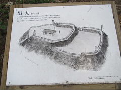 出丸跡 主郭尾根の最先端にある曲輪である。 独立した砦となっており本丸跡を守るためのものである。 上下二段の曲輪と土塁からなる。 ![]() |