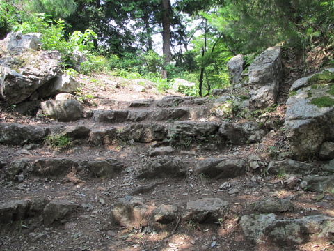 中丸跡 大堀切跡の北にある曲輪で三段からなる。それぞれの曲輪に横矢を設けている。石垣が見られる。 ![]() |