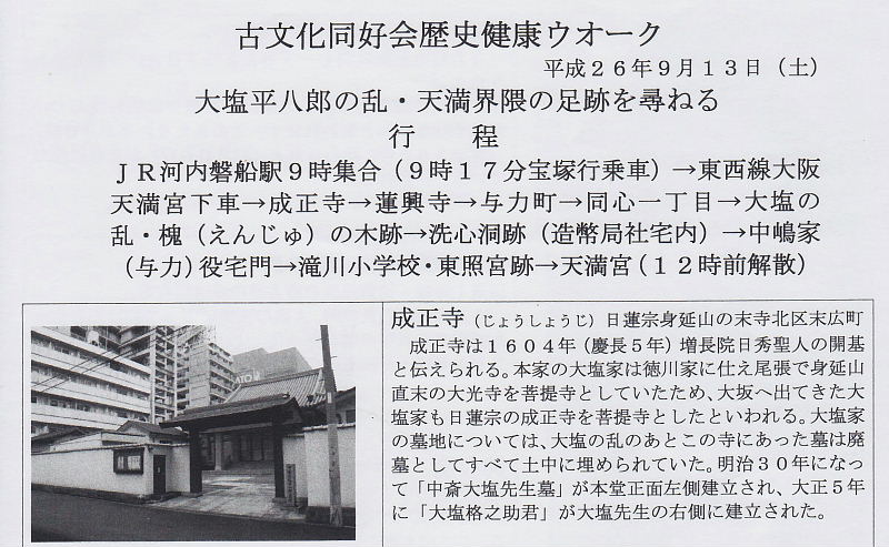 | 今回の歴史ウォークは、大塩平八郎の乱・天満界隈を散策、いろいろな史跡を尋ねることが出来ました。 高尾さん、本当にお世話になりました。感謝申し上げます。 次回のウォークは、10月11日(土)枚方東部探訪です。JR長尾駅 午前9時30分集合。 行程は、生俊寺〜伝王仁墓〜旧田中家鋳物民俗資料館〜JR藤阪駅 12時解散です。 案内は、伊東征八郎さんです。多くの皆さんの参加をお待ちしております。 |