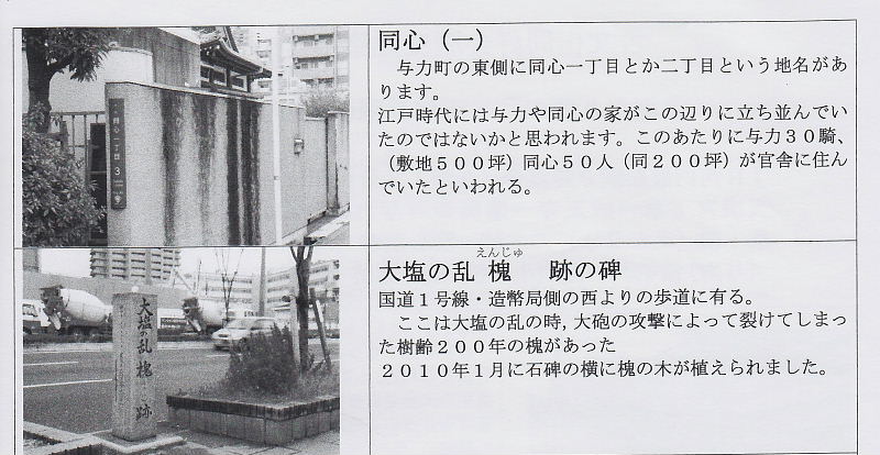 | 与力町 江戸時代には与力の役宅があった所と思われ、与力町という地名が今も残っております。 大塩平ハ郎が一番の悪党とした東町組与力・朝岡加之丞はこの与力町に屋敷があったとされる。天保8年2月19日午後4時頃、東町奉行・跡部山城守と新任の西町奉行・堀伊賀守が巡見の途中、朝岡邸で休息の段取。ここでいっきょに殺害の手筈であったが同志の裏切りで失敗。 同心(一) 与力町の東側に同心一丁目とか二丁目という地名がある。 江戸時代には与力や同心の家がこの辺りに立ち並んでいたのではないかと思われます。この辺りに与力30騎、(敷地500坪)、同心50人(同200坪)が官舎に住んでいたといわれる。 |