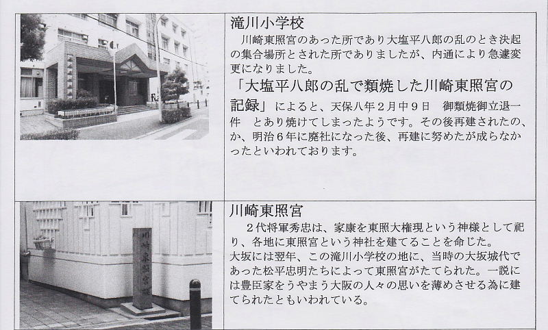 | 川崎東照宮のあった所であり大塩平ハ郎の乱のとき決起の集合場所とされた所でありましたが、内通により急濾変更になりました。 「大塩平八郎の乱で類焼した川崎東照官の記録」によると、天保九牛2月9日、御類焼脚立退一件とあり焼けてしまったようです。その後再建されたが、明治6年に廃社になった後、再建に努めたが成らなかったといわれております。 |