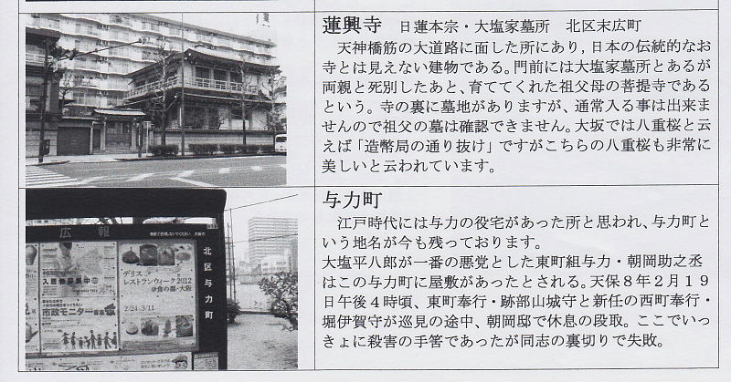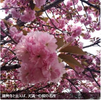 | 蓮興寺と言えば、天満一の桜の名所 大塩平八郎の大塩家の墓所があるお寺さん。 大塩家代々のお墓で、7歳で父母と死別した、平八郎を育てた、、祖父母の菩提寺でした。。。 ここのお薦めはなんと言っても春の八重桜。 天満一と言って良い位に立派な桜が、塀越しに歩道に張り出して咲き誇ります。 大阪で八重桜と言えば「造幣局の桜の通り抜け」ですが、こちらは街歩きの中でも最高に美しい桜を楽しむことができます。 (WEBを参照) |