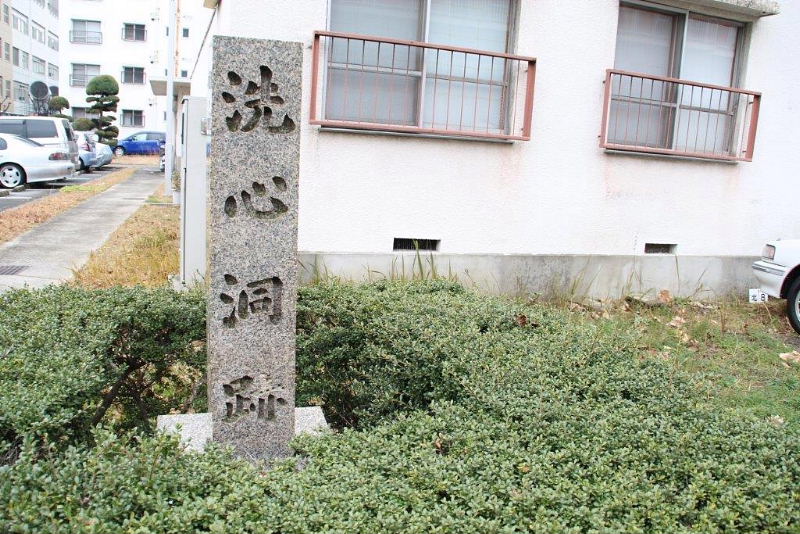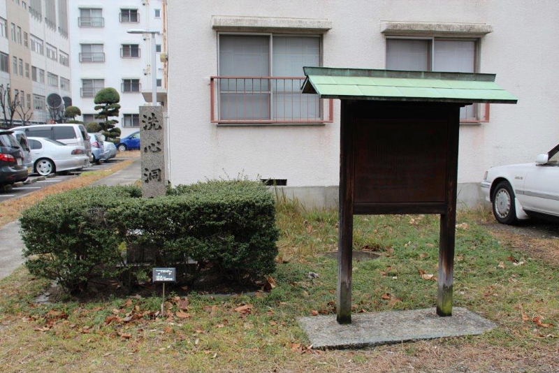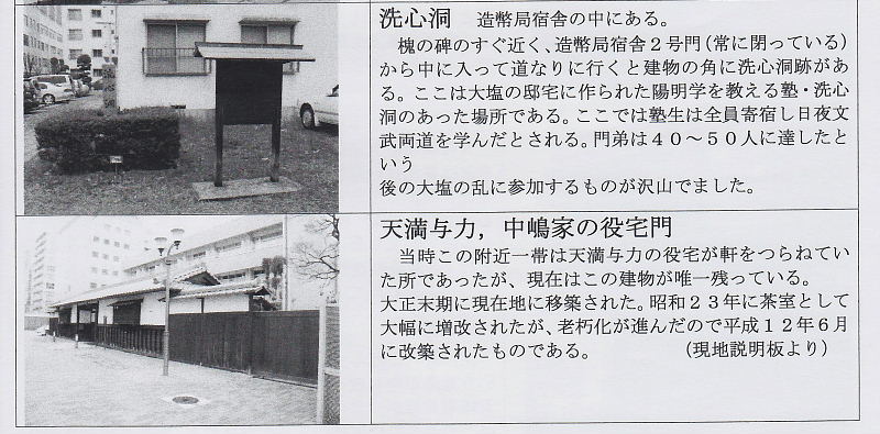 | 槐の碑のすぐ近く、造幣局宿舎2号門から中に入って道なりに行くと建物の角に洗心洞跡がある。 ここは、大塩の邸宅に作られた陽明学を教える塾・洗心洞があった場所である。ここでは塾生は全員寄宿し日夜文武両道を学んだとされる。門弟40〜50人に達したという。 後の大塩の乱に参加するものが沢山出ました。 |