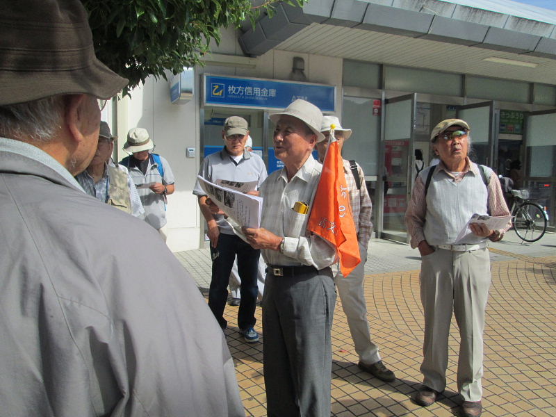 交野歴史健康ウオークは9月13日(土)午前9時、JR河内磐船駅前に集合。当日は幸い晴天に恵まれ、31名(会員18名)が参加され盛大に開催されました。
