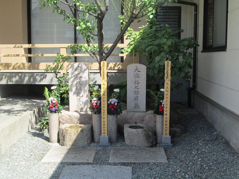 | 成正寺は1604年(慶長5年)増長院日秀聖人の開基と伝えられる。本家の大塩家は徳川家に仕え尾張で身延山直末の大光寺を菩提寺としていたため、大坂へ出てきた大塩家も日蓮宗の成正寺を菩提寺としたといわれる。大塩家の墓地については、大塩の乱のあとこの寺にあった墓は廃墓としてすべて土中に埋められていた。明治30年になって「中斎大塩先生墓」が本堂正面左側に建立され、大正5年に「大塩格之助君」が大塩先生の右側に建立された。 |