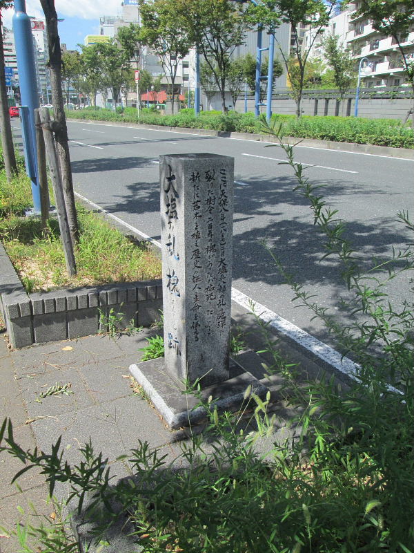 | 国道1号線・造幣局側の西寄りの歩道にある。 ここは、大塩の乱の時、大砲の攻撃によって裂けてしまった樹齢200年の槐(えんじゅ)があった。 2010年1月に石碑の横に槐の木が植えられました。 |