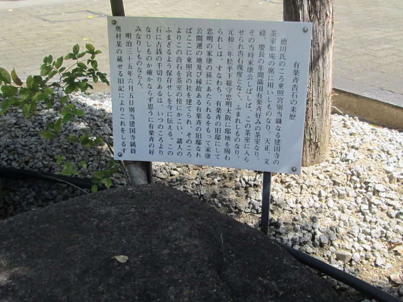 | 徳川氏のころ東照宮別当職なる建国寺の茶室如庵の席に用いしものなり。天正、文禄、慶長の年間織田有楽斎好みの茶室なり。その当時家康公しばしば、この茶室に入らせられ沓石幾度となく、踏まれしものなり。 元和3年松平下総守忠明大阪に邸地を賜られしは、すなわち、有楽斎の旧邸にして忠明の家康の孫にあたられるをもって家康公開運の地及び縁故ある有楽斎の旧邸なればここに東照宮の社を建てられ、そのころよりこの沓石を茶室の傍にかこい、諸人のふまざるよう保存せしを今に伝える。この石に古銭の千切りあるは、いつのころよりなりしものか確かならず思うに有楽斎のこのみなりしものならん。 明治35年6月5日別当建国寺属員奥村某の蔵せる旧記によりこれをしるす。 |