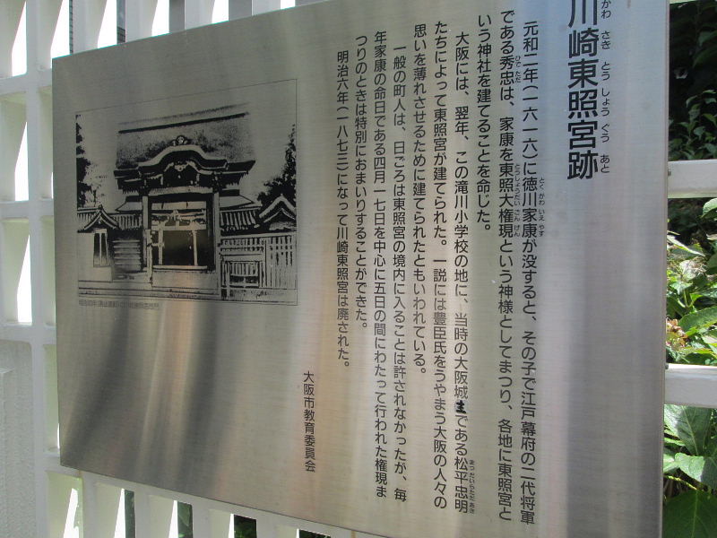 | 2代将軍秀忠は、家康を東照大権現という神様として祀り、各地に東照宮という神社を建てることを命じた。 大坂には翌年、この滝川小学校の地に、当時の大坂城代であった松平忠明たちによって東郷宮がたてられた。 一般の町人は、日ごろは東照宮の境内に入ることを許されなかったが、毎年家康の命日である、4月17日を中心に、5日の間に行われた権現祭りの時は特別にお参りすることができた。 また一説には豊臣家をうやまう大阪の人々の思いを薄めさせる為に建てられたともいわれている。 |