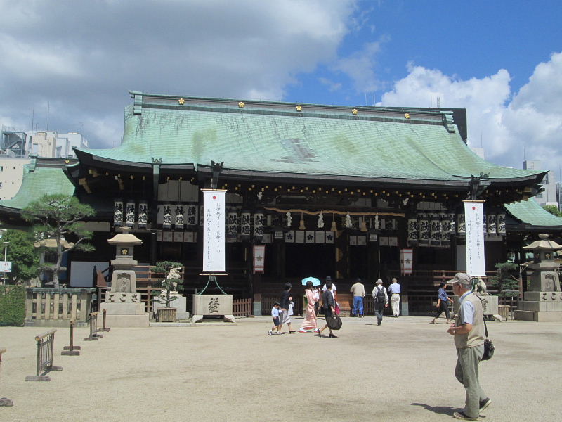 | 大阪天満宮は社伝によれば、孝徳天皇が長柄豊碕宮に遷都した際、皇城鎮護の神として奉斎したのが境内社の大将軍社で、当地は大将軍の森と呼ばれた。901年(延喜元年)菅原道真が大宰府に向かう途中、同社に参拝したこともあり、953年(天暦7年)村上天皇の勅願で天満宮が同社境内に創祀され、大将軍の森は天神の森と呼ばれるようになったという。 古くは南中島の惣社で、中島天満宮と呼ばれ、現境内北方の明星池付近に鎮座していた。現在地に移されたのは寛文年中(1661〜73年)で、大坂三郷天満宮の産土神として奉斎され、毎月25日には参詣者で賑わった。 1342年(正平2年)楠木正行と山名時氏の合戦、1570年(元亀元年)織田信長の石山攻め、1837年(天保8年)大塩平八郎の乱などの兵火で焼失した。本殿は1845年(弘化2年)に再建、正遷宮された。他の建物の修築・造替事業が完成したのは1901年(明治34年)であった。 |