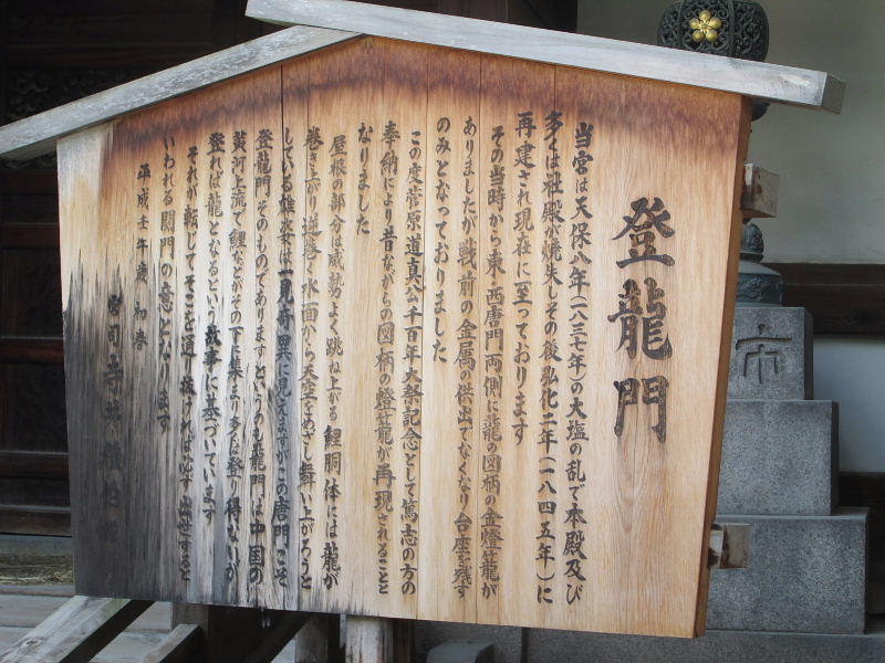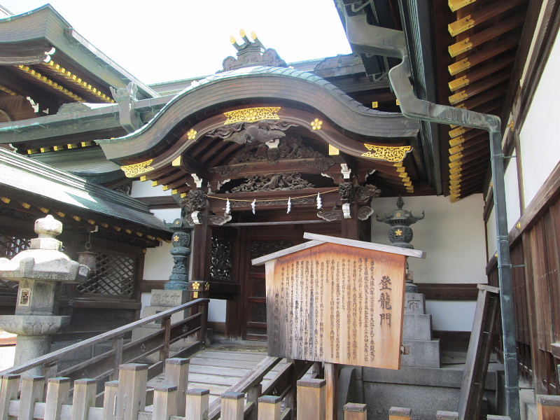 | 神社の説明によると、当宮は天保8年の大塩の乱で本殿及び多くの社殿が焼失し、その後弘化2年(1845)に再建されて現在にいたっております。と書かれています。 その当時から東・酉唐門両側に龍の図柄の金燈寵がありましたが戦前の金属の供出でなくなり台座を残すのみとなっておりました。この度道真公千百年大祭紀念として篤志家の奉納により昔ながらの図柄の燈龍が再現されることとなりました。 屋根の部分は威勢よく跳ね上がる鯉胴体には龍が龍が巻き上がり逆巻く水面から天空をめざして舞い上がろうとしている雄姿は一見奇異に見えますが、この唐門こそ登龍門そのものであります。というのも龍門は中国の黄河上流で鯉などがその下に集まり多くは登り得ないが登れば龍となるという故事に基づいています。 それが転じてそこを通り抜ければ必ず出世するといわれる関門の意となります。 |