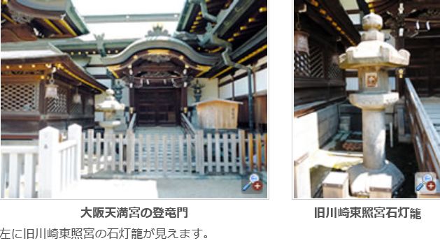 | 現在、川崎東照宮の遺構は当山の本地堂の他、学問の神様で知られる菅原道真公を祀る大阪天満宮の境内に石灯籠、鳳輦庫が移築されています。星合の池奥にある鳳輦庫の屋根瓦には葵の御紋が見られます。 |