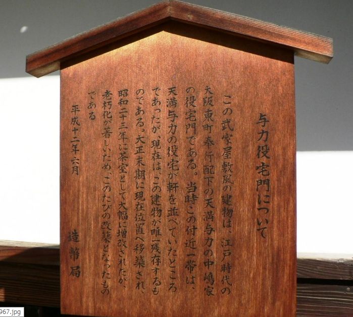 | こちらは大坂東町奉行所配下の与力・中嶋家の役宅門。洗心洞の石碑の近くにあります。 造幣局の説明看板によると、当時この付近一帯は天満与力の役宅が軒を並べていたのですが、今でも存在しているのはこの建物のみ。 大正末期に現在の場所へ移築され、昭和23年に茶室として大幅に増改。しかし、老朽化が激しいため、平成12年6月に改築されたそうです。 大塩平八郎の屋敷も、このような感じの門構えだったのでしょうか? |