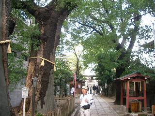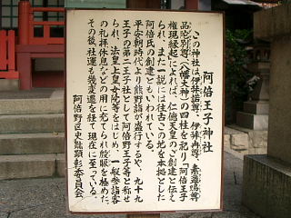 | 安倍晴明神社のすぐ南に、大阪府内に残る唯一の王子社、阿倍王子神社がある。 阿倍王子神社は、パンフレットによれば、仁徳天皇によって創建され、平安時代の初期天長3年(826年)弘法大師が、淳和天皇の勅命で当社に参り、疫難退散の祈祷をして成功し、痾免寺の勅額を賜ったという。 阿倍野は古代の豪族阿倍氏の居たところで、奈良時代には氏寺阿倍寺があり、「阿倍寺千軒坊」と伝わるほどの大寺であったという。阿倍氏がよそに移住し、さらに阿倍寺も四天王寺に併合される中、熊野信仰が盛んになり熊野街道の道筋に、この寺があったので熊野王子となった。 ちょうど四天王寺と住吉大社の中間にあり、王子社にふさわしい場所であった。 |