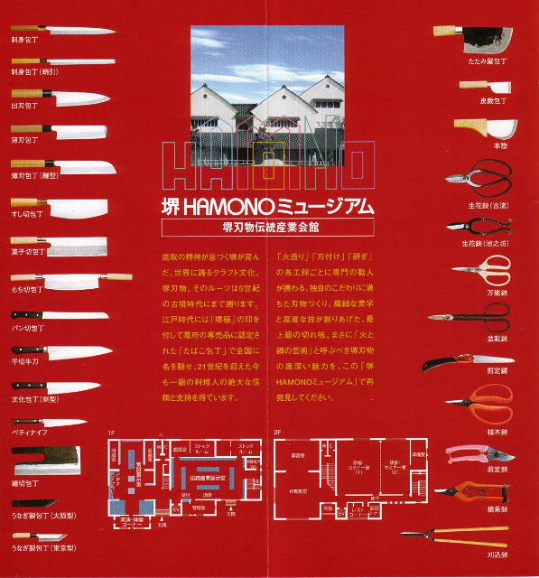 堺の刃物を中心とした伝統産業を、気軽に見て、触れて、体験していただける会館です。打刃物の製造工程見学や、刀付・研ギ教室などの体験を通じて、堺が誇る刃物職人の「匠の技」に触れてただくことができます。また堺の地場産品の展示・販売も行っており、堺の魅力を再発見していただけます。 |