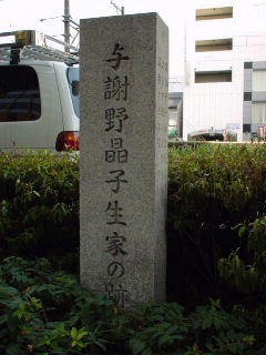 ![]() ![]() 与謝野晶子の歌碑と生家跡・大道通り(阪堺線・宿院駅北) 海こひし 潮の遠鳴りかぞえつつ 少女となりし 父母の家 (歌碑が建てられている) |
