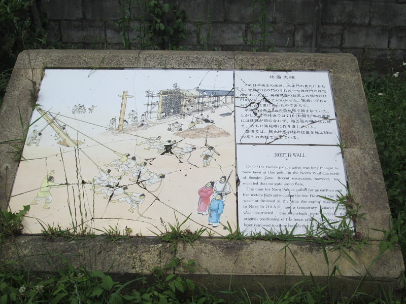 | 北面大垣 ここは平城宮の北辺、朱雀門の真北にあたる。宮城の12の門のうちの一つ猪使門(いつかいもん)の推定地であつたが、発掘調査の結果この場所には門がなかったことがわかった。東西いずれかにずれた位置にあったのであろう。 平城宮は高さ5mの築地塀で囲まれていた。しかし、この付近では710(和銅3)年の遷都には建設が間に合わず、掘立柱の塀を仮に建て、のちに築地塀に作り直している。整備では、掘立柱塀の柱の位置を地上80cmの高さの木柱で示している。 さてその場所だが、復元された大極殿の北約100m程の所、東西に走る県道の北側に位置する。 |