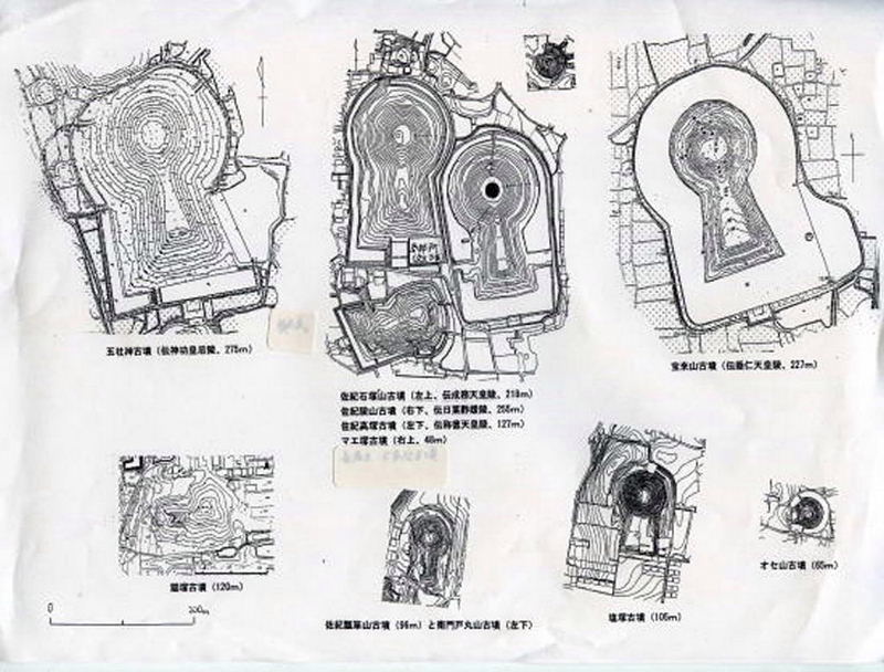 ![]() (左上)佐紀石塚山古墳218.5m (右上)佐紀陵山古墳206m (左下)佐紀高塚古墳127m |