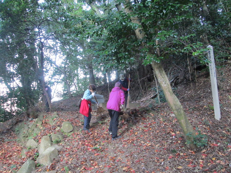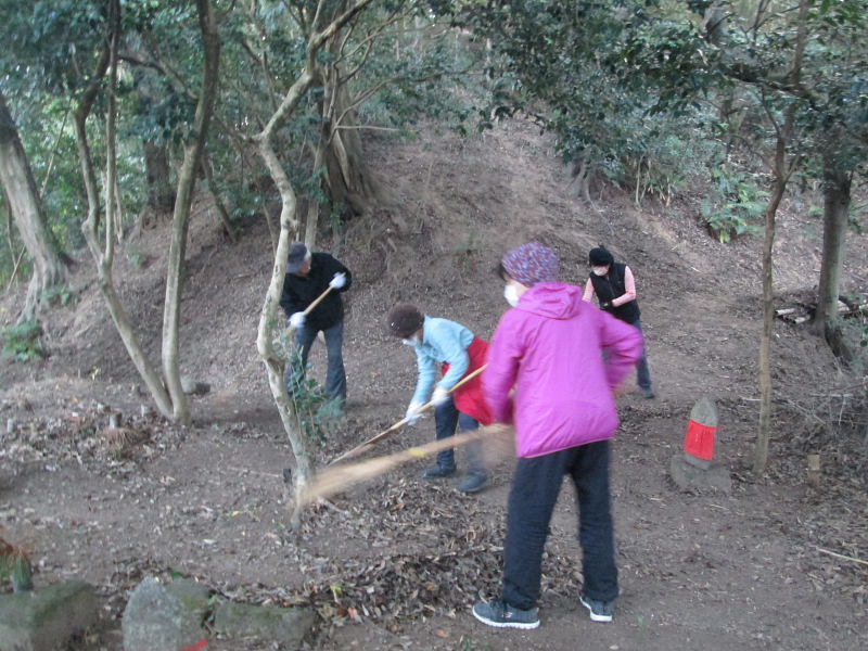 当日は12月としては異例の温暖な中、熊手で落ち葉を掃き取っていき、