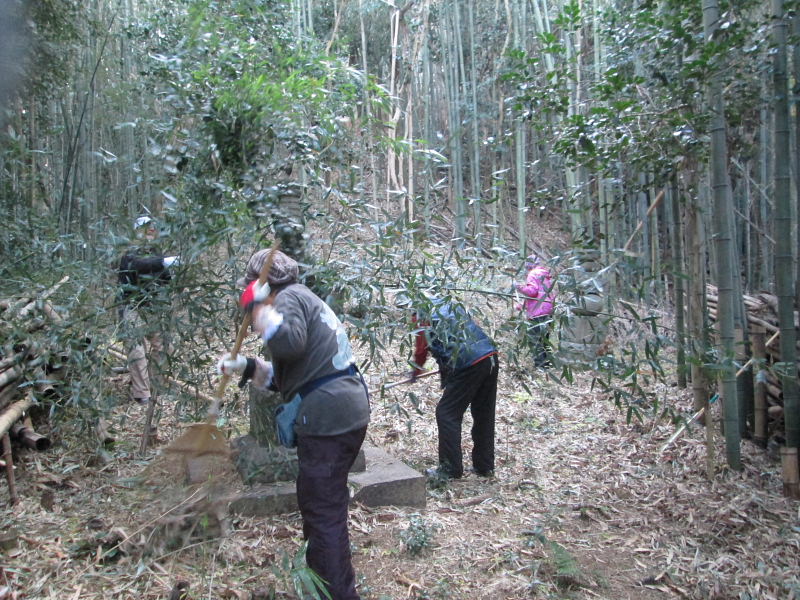 墓の周りの落ち葉や小枝、暴風で倒れた樹木や竹などを取り払い、