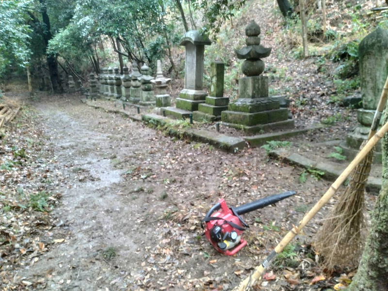 墓の周りの落ち葉や小枝、暴風で倒れた樹木や竹などを取り払い、