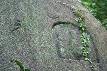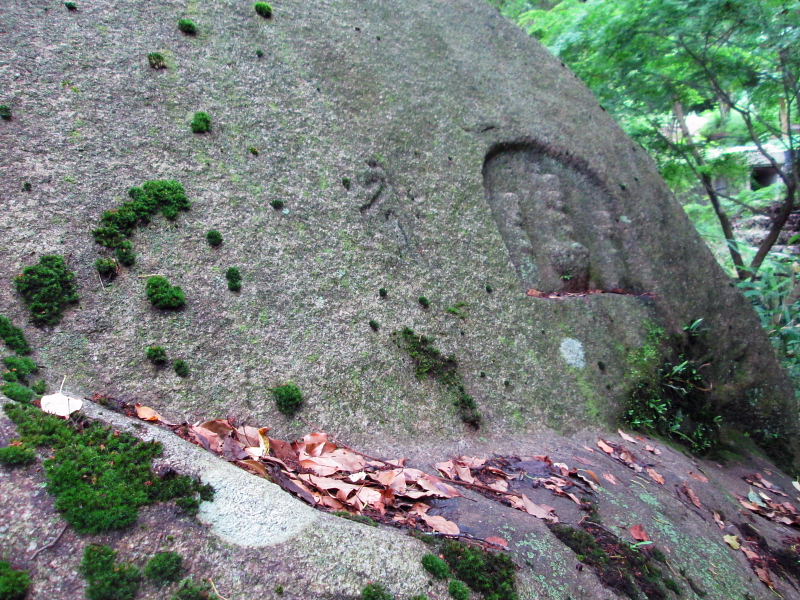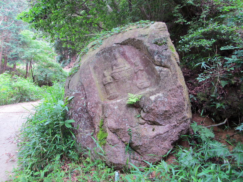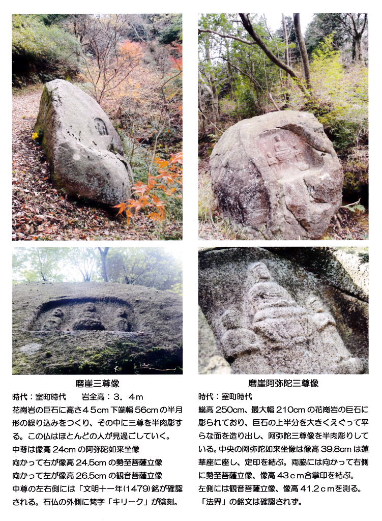 | 花崗岩の巨石に高さ45cm下端幅56cmの半月形の繰り込みをつ<り、その中に三尊を半肉彫する。この仏はほとんどの人が見過ごしてい<。 中尊は像高24cmの阿弥陀如来坐像、向かって右が像高24.5cmの勢至菩薩立像、向かつて左が 像高26.5cmの観音菩薩立像、中尊の左右側には「文明十一年(1479)銘が確認される。 石仏の外側に梵字「キリーク」が陰亥。 |