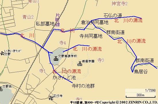 | 北川は関西創価学園の南の竜王山の下あたりを源流とするものと、郡南街道の谷から流れる谷川と、一つ北の石仏の道から交野山への登リ口となっている谷に流れる川が倉治の墓の中央付近で合流している。そして大きな扇状地を形成して片町線(学研都市線)を越えて私部の墓地まで続いている。 この扇状地の地域が私部上河原とよばれ、江戸時代初期頃まで私部の部落があったところである。合流した川はぶどう畑の中を流れ、学研都市線の東側で南へと流れを変えて、寺村の北から流れ出た川と一つになり、交野小学校の南を、そして私部住吉神社の南を流れて落合橋で南川と合流して、前川と名前を変えて天野川に注いでいる。 |