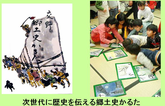 交野郷土史かるたの箱に大石を運んでいる絵が描かれています。 |