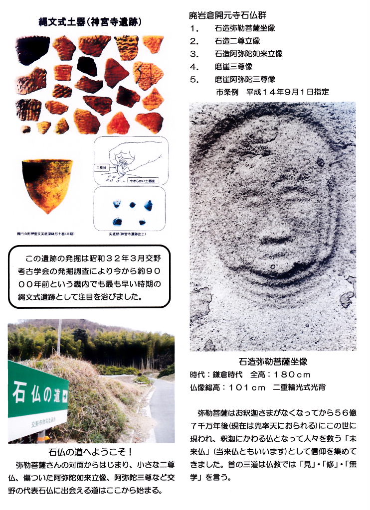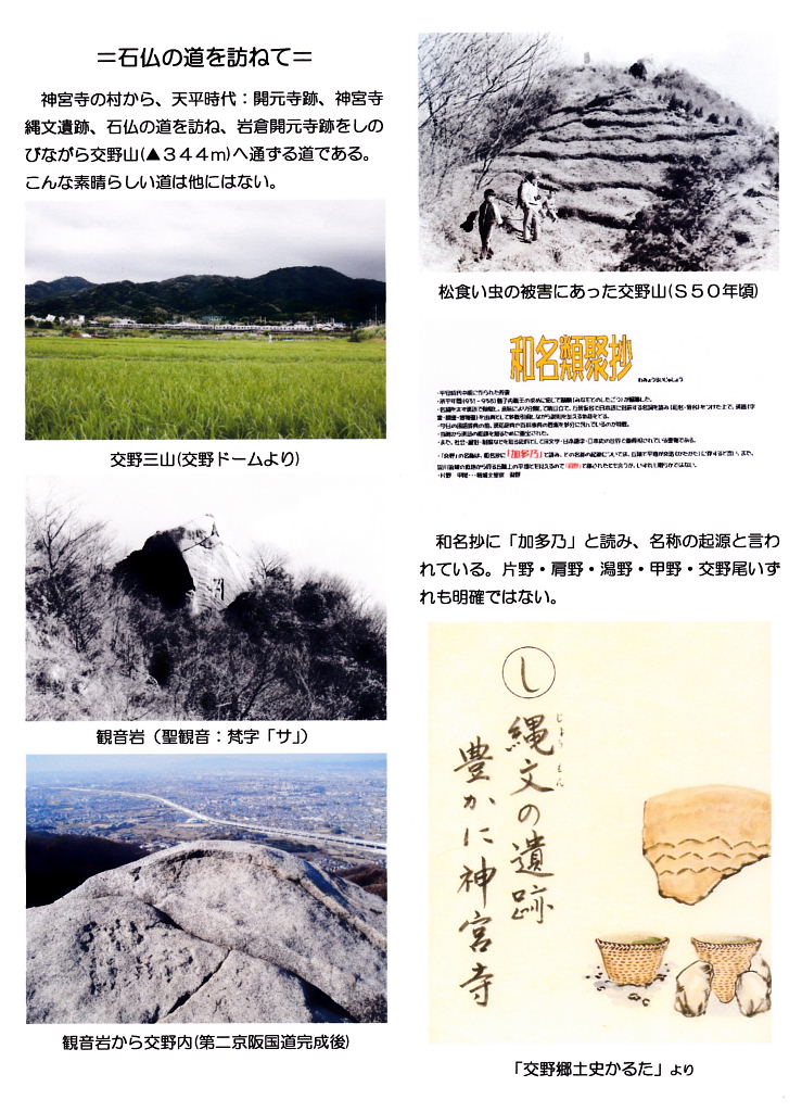 | 神宮寺の村から、天平時代:開元寺跡、神宮寺縄文遺跡、石仏の道を訪ね、岩倉開元寺跡をしのびながら交野山(▲ 344m)へ通ずる道である。こんな素晴らしい道は他にはない。弥勒菩薩さんの対面からはじまり、小さな二尊仏、傷ついた阿弥陀如来立像、阿弥陀三尊など交野の代表石仏に出会える道はここから始まる。 | |||||||||||||||||||||||||||||||