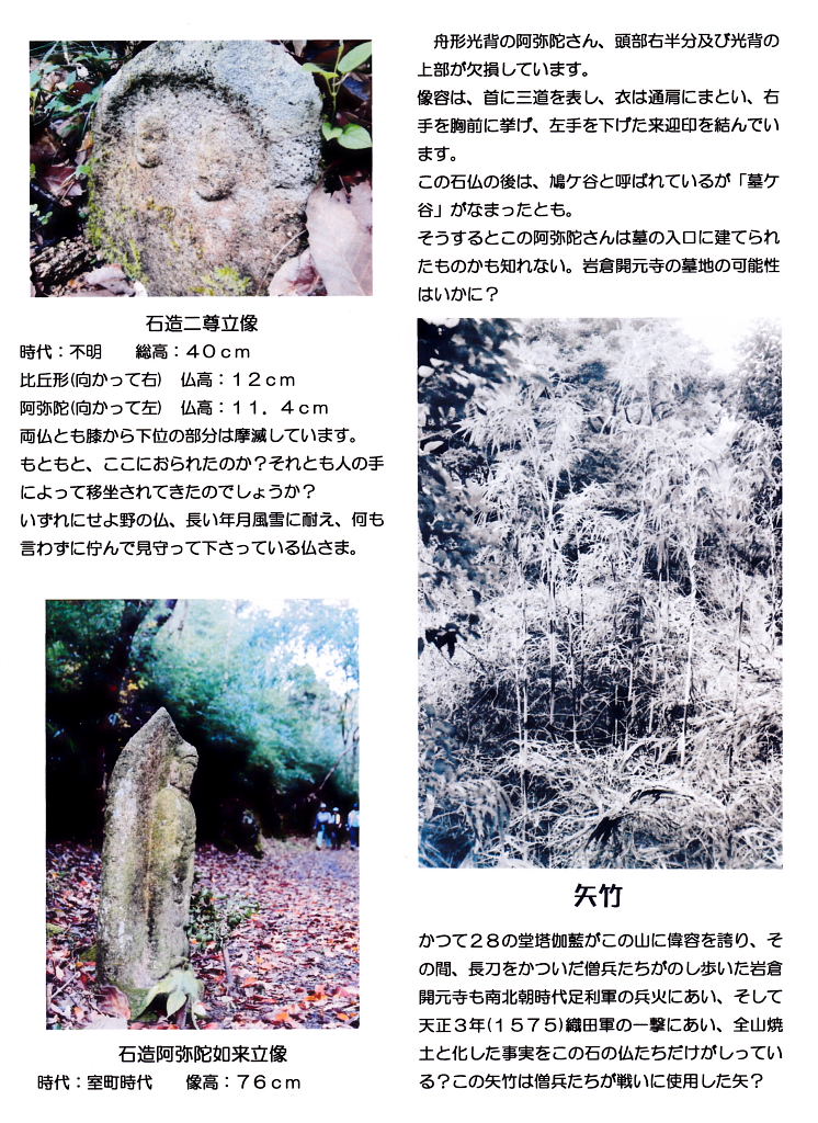 | 岩倉開元寺 かつて28の堂塔伽藍がこの山に偉容を誇り、その間、長刀をかついだ僧兵たちがのし歩いた岩倉開元寺も南北朝時代足利軍の兵火にあい、そして天正3年(1575)織田軍の一撃にあい、全山焼土と化した事実をこの石の仏たちだけが知つている? |