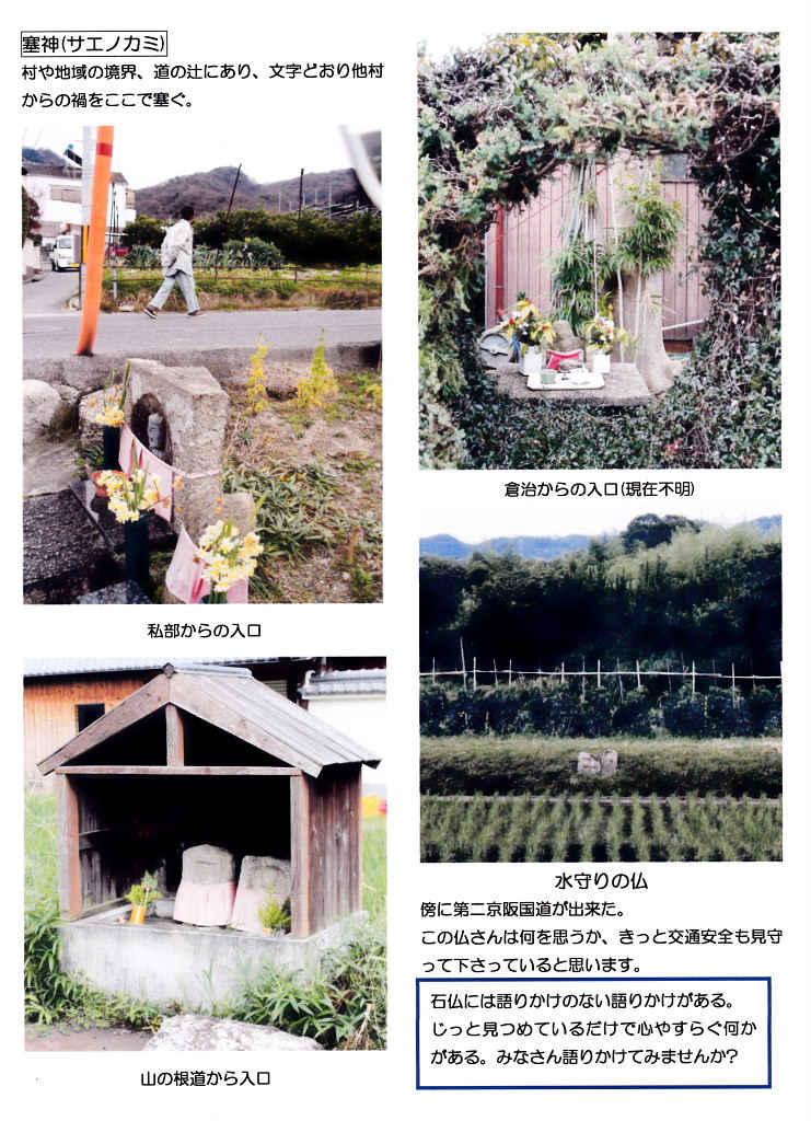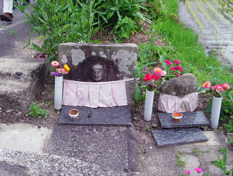 ![]() この仏さんは何を思うか、きつと交通安全も見守つて下さつていると思います。 第2京阪国道よりわずかにはずれた田圃の畦道に、「水守り地蔵」はおられた。 左側の双体仏は少し右に傾き、右の阿弥陀さんとともに長い風雪に耐えながら田畑の水を良くお守りいただきました。 すぐ東の森からこんこんと清水が湧き出し私部の田圃を潤している。 いつまでもお守りください。 |