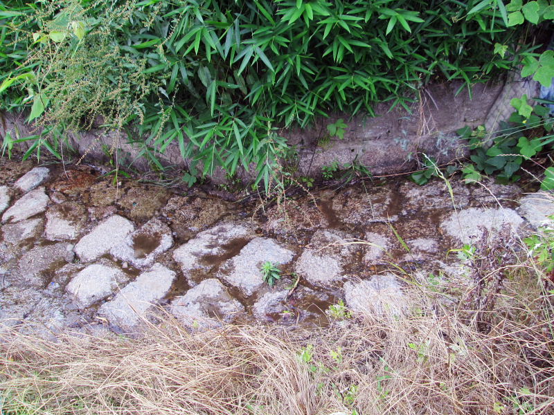 ![]() 石仏の道沿いを流れ下って、ブドウ畑の中を西流、川床は綺麗に石敷きされている。 JR学研都市線の手前で左に折れて、現在の北川に合流している。 昔は、まっすぐに私部の墓地の中を西へと流れていた。 江戸時代、万延元年(1860年)、この北川の源流を、 鳥居谷から取り出した大きな石を修羅に載せて私部の住吉神社まで運んだそうです。 |