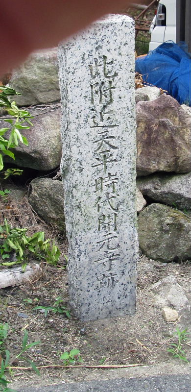 | 廃岩倉開元寺石仏群・石仏の道 交野市指定文化財 平成14年9月1日指定 言い伝えによると岩倉開元寺は神宮寺にあった開元寺を移したといわれている。 最近ではその開元寺の存在が疑われております。 しかし岩倉開元寺が存在したことは発掘調査の結果、その実在が確認されております。 この山道に石仏は五体祀られております。 |