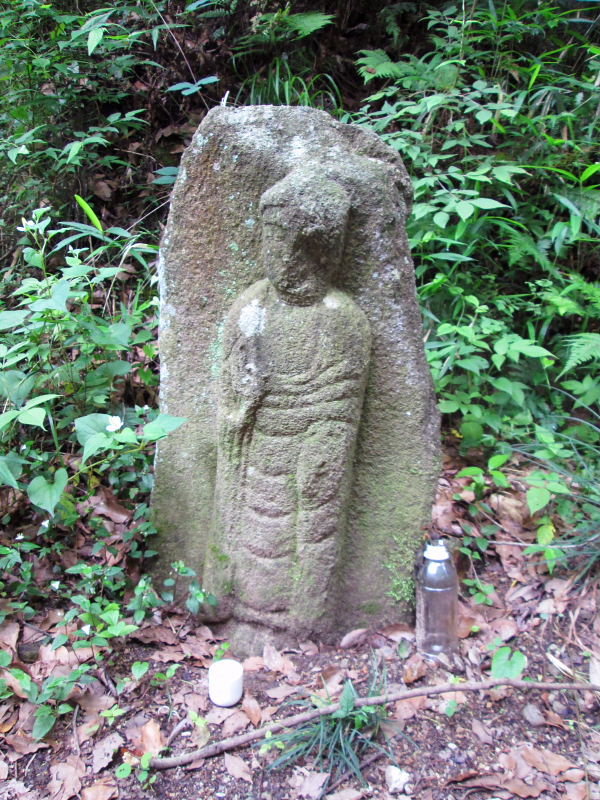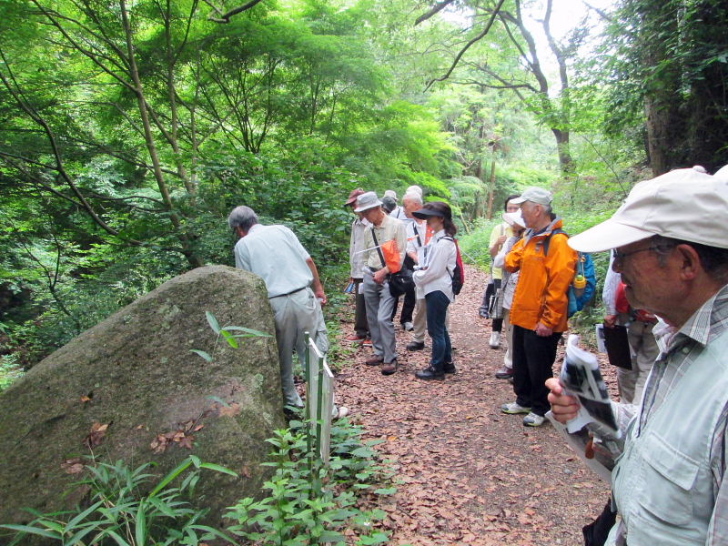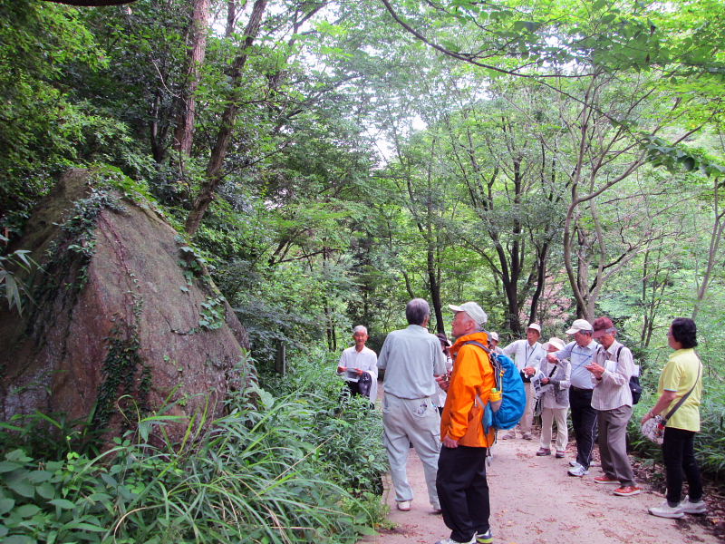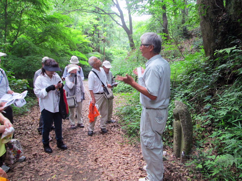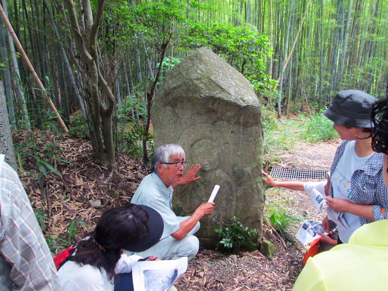 | 6月9日当日は、前日の天気予報では朝から昼過ぎまで雨模様とのことで開催が危ぶまれましたが、石仏の道付近でパラパラとした程度でその後日差しも見えて、幸いにも天候に恵まれ、18名の元気な皆さんと石仏の道を歩いて、2000年9月に始まって以来今回で154回を数える交野歴史健康ウォークを充分に楽しんで来ました。 5月18日の勉強会で、講師の平田政信氏より「交野の仏たち」のテーマで、「交野の歴史・風土記・仏たちの概要」をお話しいただきました。今回は、従来の第2土曜日開催の歴史健康ウォークに加えて、平日開催の第1回目として、「石仏の道を訪ねる」をテーマで交野歴史健康ウォークとして実施されました。 いきいきランドを出発、第2京阪国道の側道を少しばかり歩いてすぐに右折して、田んぼの畔の「水守り地蔵」に案内された。次いで私部の墓への野辺送りの参道(南郷)を通り、昔の北川の名残りと言われる「長池」を右に見て、広大な広さの私部共同墓地に到着。JR学研都市線を渡り、綺麗に石敷きがされた北川の源流沿いに、神宮寺のブドウ畑を両側に眺めながら歩くと、石仏の道への入り口の賽ノ神さんに出会います。 ![]() ここからいよいよ石仏の道へと進みます。 神宮寺の村から、天平時代:開元寺跡、神宮寺縄文遺跡、石仏の道を訪ね、岩倉開元寺跡をしのびながら交野山(▲ 344m)へ通ずる道である。こんな素晴らしい道は他にはない。弥勒菩薩さんの対面からはじまり、小さな二尊仏、傷ついた阿弥陀如来立像、阿弥陀三尊など交野の代表石仏に出会える道。(レジメより) 鬱蒼と木々が茂り鶯などのさえずりをバックに、じっくりと5体の石仏たちとの出会いを楽しみ、帰りは、私部共同墓地に立ち寄り、つづり方兄妹のふうちゃんのお墓に参拝していきいきランドで解散しました。 天候も回復少し蒸し暑さを感じる程度で、今日のウォークは歩いてよかったですなぁ!との感想でした。 ※ HPの掲載に当たり、講師のご厚意で当日配布されたレジメなどを参考にさせて頂きましたこと、 記して感謝申し上げます。 その他、交野広報に掲載されました、諸々の資料を参考にさせて頂きました。 |
