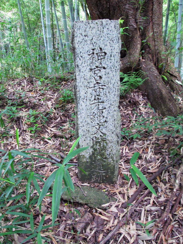 「神宮寺」とは一般的に宮寺とも言い、神社に付属して建てられたお寺のことです。日本に仏教が入って来た時に、それを日本の神々とどう共存させるかを考えた結果、日本の神々は、日本人に理解しやすいように仏が仮の姿を現したものであるという考え方が生まれました(本地垂迹説=ほんちすいじゃくせつ)。そこで神社の境内や周辺に寺が建てられ、神社と寺院の両方を管理して神社の祭祀を仏式で行う社僧が置かれるようになりました。このような考え方により、奈良時代にはすでに越前国(現在の福井県)気比神宮で神宮寺が建てられています。 交野の「神宮寺」は郡南街道沿いの通称「宮山」と呼ばれる所にあったといわれています。宮ノ下とは、この神宮寺の下の地域という意味です。また、神宮寺と対をなしていた神社の名前は伝わっていませんが、素盞鳴尊(すさのおのみこと)を主神とし、末社に金比羅・稲荷・天神・春日・愛宕の神が祀られていて、明治8年に機物神社に合祀されました。 |