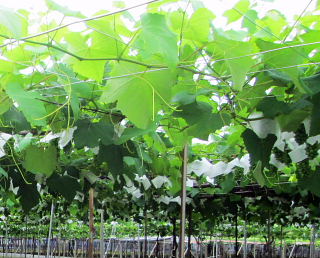年代ごろから稲田桃が植えられるようになりました。この桃は高値で取引される甘く優れた品種だったので、明治時代の後半から太平洋戦争まで栽培されていました。 しかし、桃の収穫量は台風や戦争中の人手不足などにより著しく低下していきました。また、戦争中の食糧難により枯れた桃畑の空き地に大豆やさつまいもなどを栽培し、より現実的な食糧増産に努め、ますます桃の栽培に適さない環境となっていきました。 そこで戦後、桃に代わる新しい果樹を栽培することになり、昭和24年にブドウの試験栽培が始まりました。その試みは大成功し、「神宮寺ぶどう」としてその名を知られるようになりました。 |
