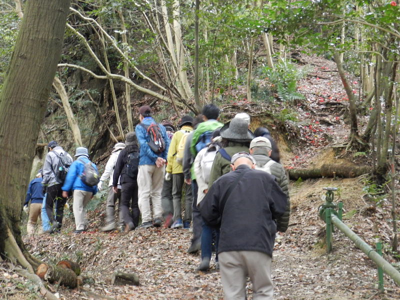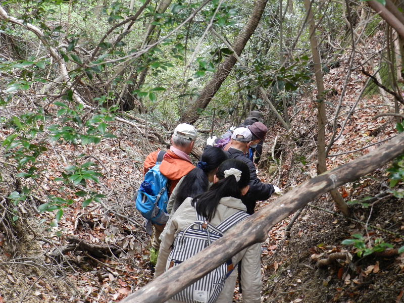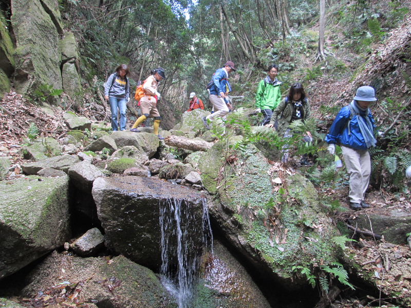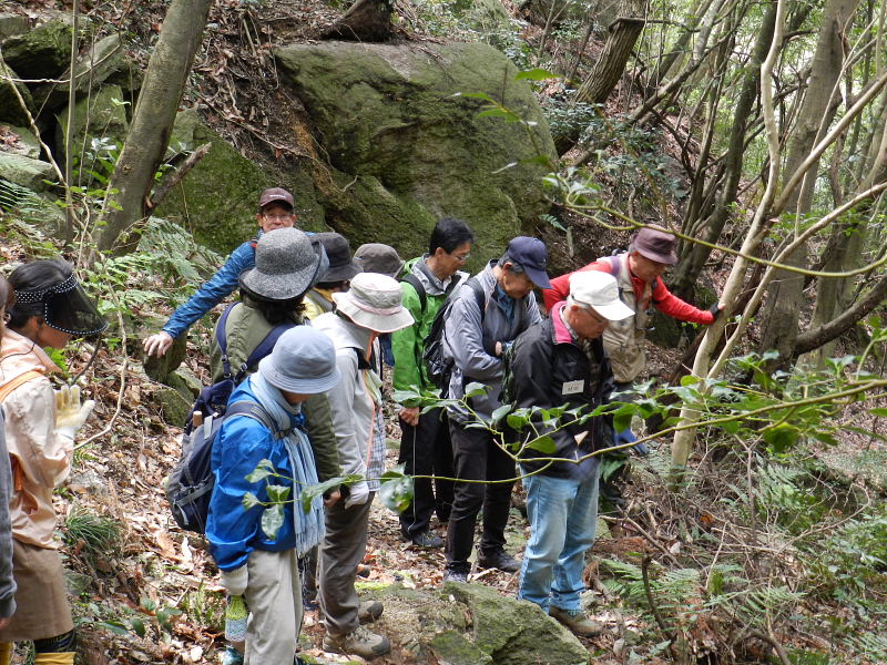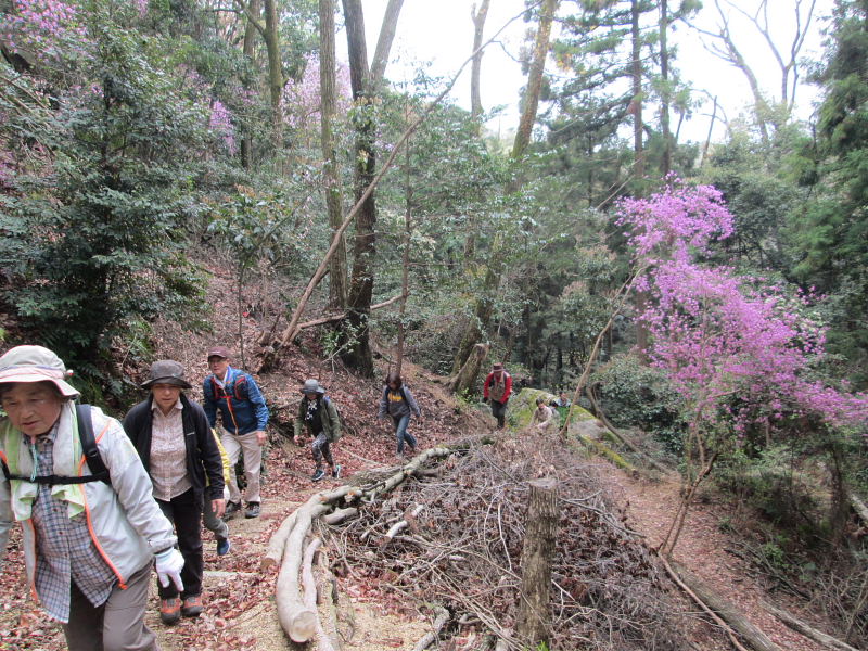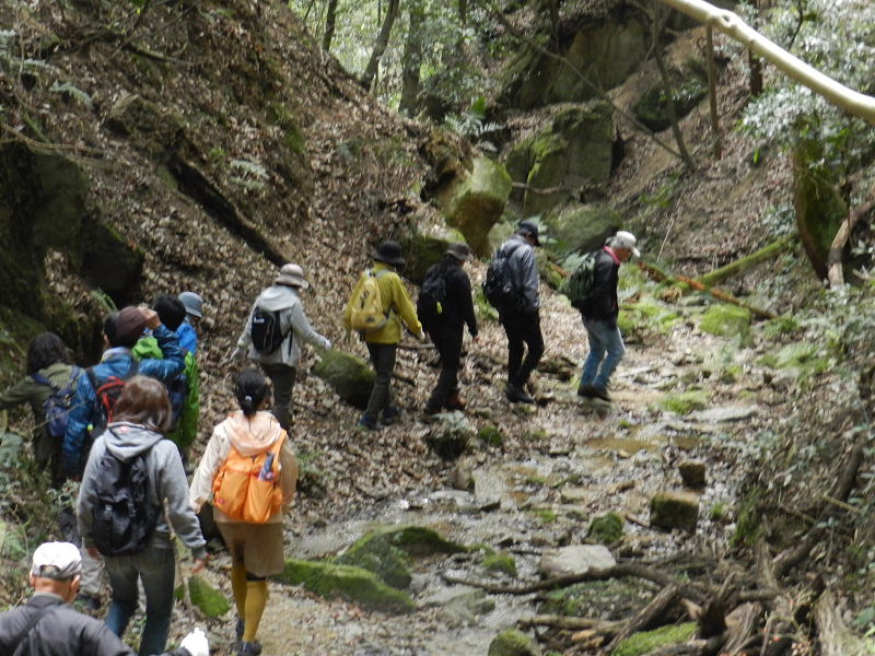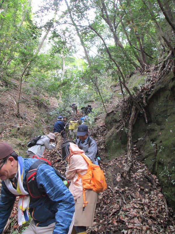 4月7日(土)午前9時、私市駅に元気な20名が集合。3月の23日より13日間暖かい晴天続きでしたが、前日の午後より天候が急変雨が降り出し夜半には前線も通り過ぎたようです。当日は朝方は少し寒さも感じられましたが、まずまずのウォーク日和となりました。![]() 土生川を遡り、獅子窟寺の修験道をゆっくりと踏みしめながら歩き、ミツバツツジが咲き誇る尾根筋と立木が倒れたりして歩きにくい尺治川の支流の沢下りを十分に味わってきました。(健脚コース) 途中、昨年6月に開催しました、「獅子窟寺の三十三観音巡り」の中、32番に参拝し記念撮影しました。参加された元気な皆さんのお陰で、今は廃道となった尾根筋と沢下りなど、春先のウォークを楽しむことができ本当に有難うございました。 今回のコースは、15年前の2003年9月、平田さんの案内で、「土生川の源流を訪ねてー土生川を遡り、獅子窟の岩々を訪ねるー」以来の探訪でした。源流付近も15年前の雰囲気は全然感じられません、途中で新しい急峻な坂道へと繋がっていました。 「月輪の滝から獅子窟寺までのルート」は、昔、ハイキングコースになっていて何度か歩いた記憶があり、昨年歩いてみましたがルートが分からず、西野さんのホームページと助言を頂き、会員の川田さんと二人でコースの一部修復・選定をしました。 また、川田さんには、ウォーク当日の最後尾の安全管理と写真撮影など大変お世話をお掛けしました。重ね重ね御礼申し上げます。 ※ 西野さんのホームページ「獅子窟寺の谷と山を歩くシリーズ」を 参照させて頂きました。記して感謝申し上げます。 |