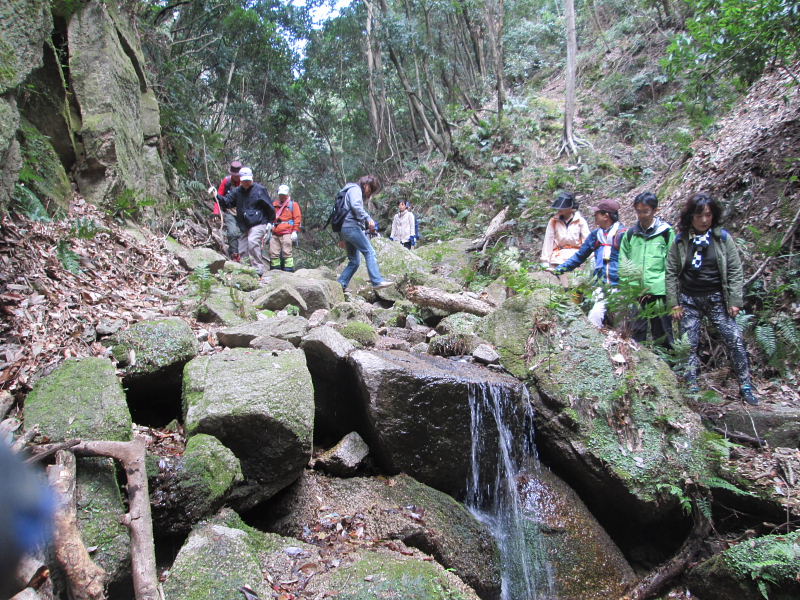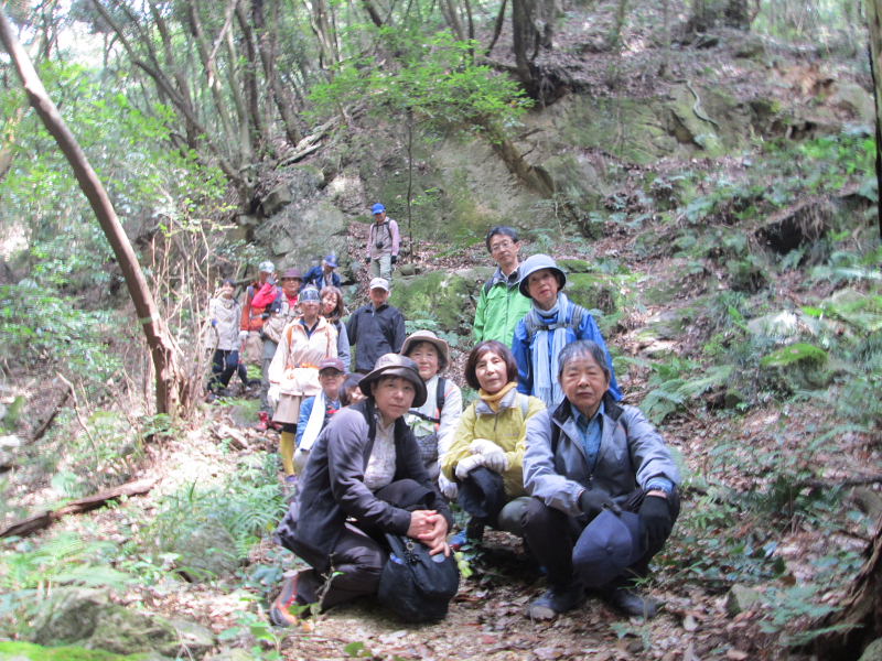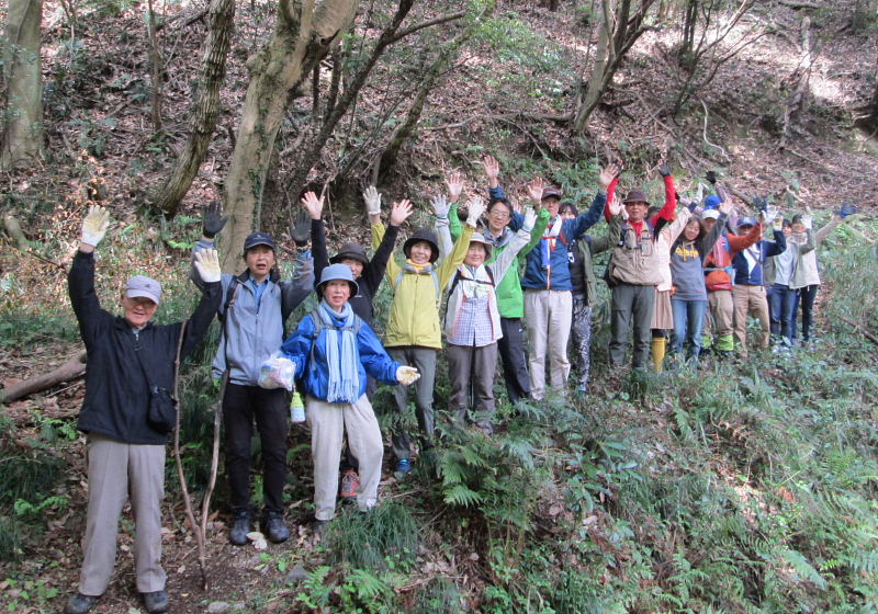 ![]() 獅子窟寺の修験道を歩き終えて、みんなで歓声を上げる! 月の輪の滝入口付近 |