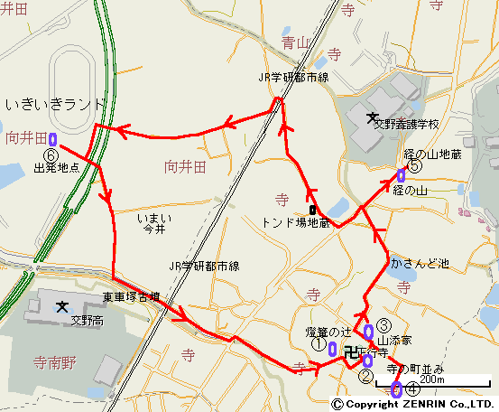 当日の行程と写真撮影場所(数字で表示) 出発:いきいきランド→東車塚古墳→@寺村・燈篭の辻→A正行寺→ B重要文化財・山添家前→C寺村の町並み(かいがけの道へと)→ D経の山地蔵→トンド場地蔵→Eいきいきランド